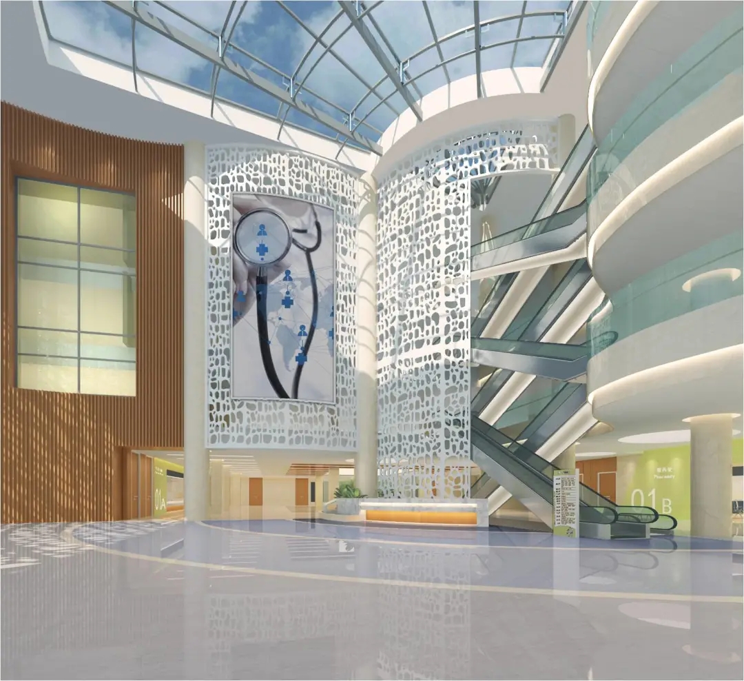 住院大廳天棚采用大面積玻璃采光頂,節(jié)約采光成本的同時(shí)營造廣闊的視覺空間。墻面采用仿石材瓷磚,與石材地面銜接,穿插氟碳烤漆鋼板柱子,通過對點(diǎn)線面的梳理,凸顯簡約、大氣、通透、現(xiàn)代化的視覺美感。