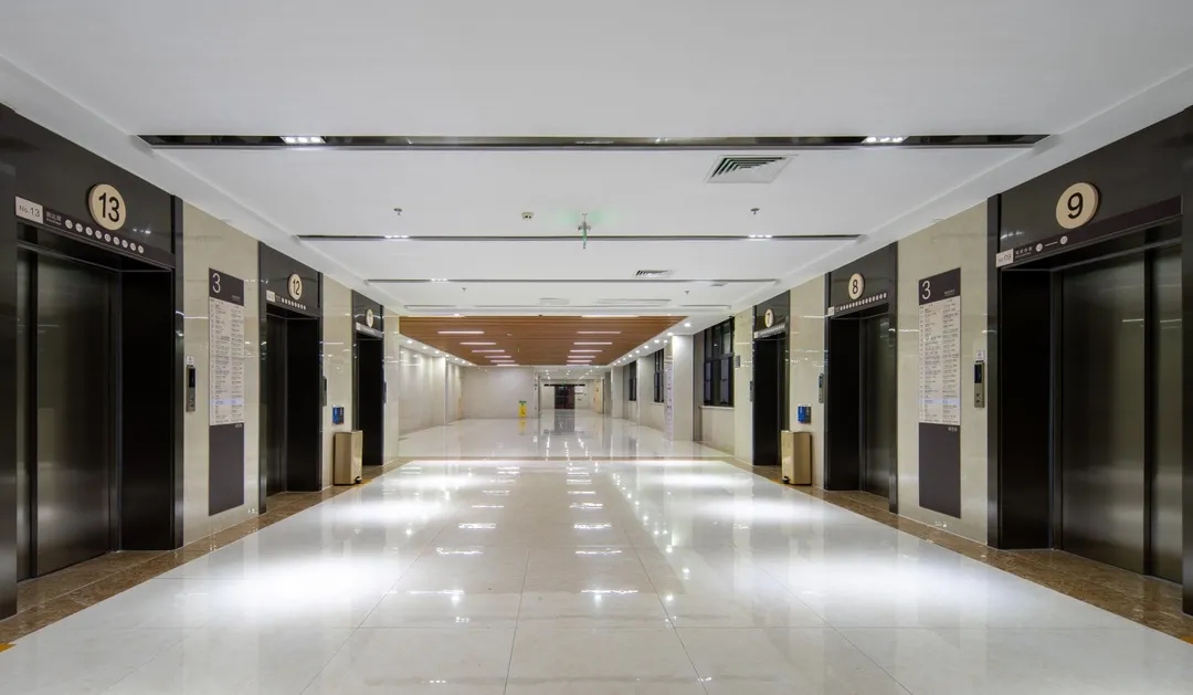 電梯廳天花采用石膏板吊頂輔以不銹鋼裝飾增加線條感及層次感,同時(shí)與不銹鋼電梯套口交相輝映,地面采用大理石提升整體裝修檔次。