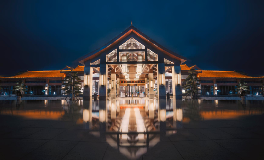 9#樓與8#樓互成犄角之勢,主要功能為酒店大型宴會之所,同樣為扇形建筑體、網(wǎng)架鋼結(jié)構(gòu)屋面。通透的山水畫沖孔鋁單板輔以木紋造型鋁板包梁,述說著貴州山水的靈性,也貫穿延續(xù)了整體建筑風格。