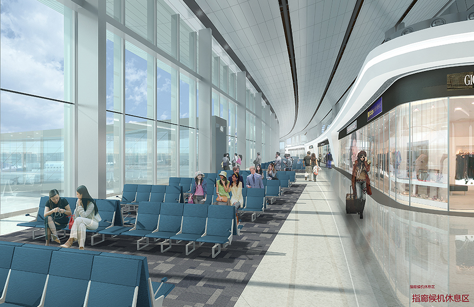 北京大興國際機場航站樓形如展翅的鳳凰,五指廊的造型完全以旅客為中心。整個航站樓有82個登機口,但是旅客從航站樓中心步行到達任何一個登機口,所需的時間不超過8分鐘。博大建設集團承建了中南指廊國際出發到達區域室內裝飾工程。